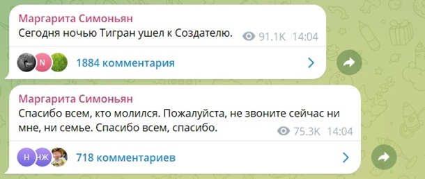 „Сьогодні вночі Тигран відійшов до Творця”, – зазначила вона.